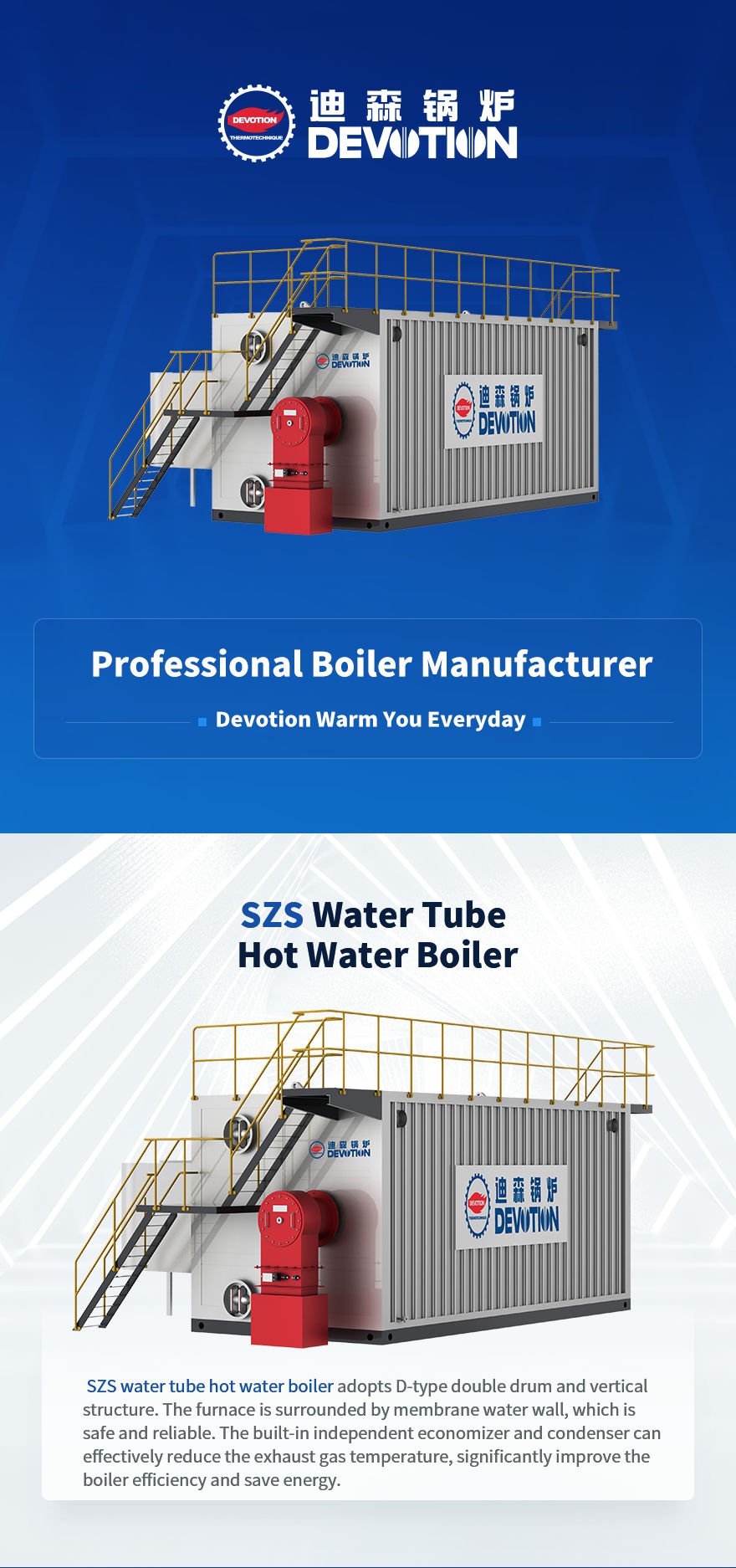 Водотрубный водогрейный котел Devotion СЗС имеет двойной барабан D-типа, продольную конструкцию, с топкой справа и пучком конвекционных труб слева. Печь окружена мембранными стенками с водяным охлаждением. Это безопасно и надежно, не Легко взрывается и имеет встроенный независимый энергосберегающий конденсатор.Конденсатор может эффективно снизить температуру выхлопных газов, значительно повысить эффективность котла, является энергосберегающим и эффективным.